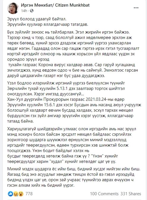 Мөн Иргэн Б.Мөнхбатыг 2021.03.24-ны өдөр Хан-Уул дүүргийн прокурорын газраас Эрүүгийн хуулийн 15.6.1 дэх хэсэгт зааснаар Бусдын амь насанд аюул учруулж болзошгүй халдварт өвчин халдаах эсвэл тархах орчин бүрдүүлсэн гэсэн зүйл ангиар Эрүүгийн хэрэг үүсгэн ялдагчаар татагджээ. Тэрээр энэ талаар өөрийн цахим хуудаснаа нийтэлжээ.