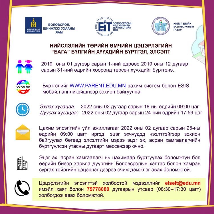 Бүртгэлийг WWW.PARENT.EDU.MN цахим систем болон ESIS мобайл аппликэйшнээр зохион байгуулна.