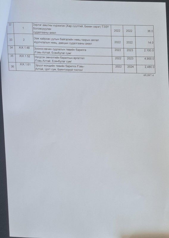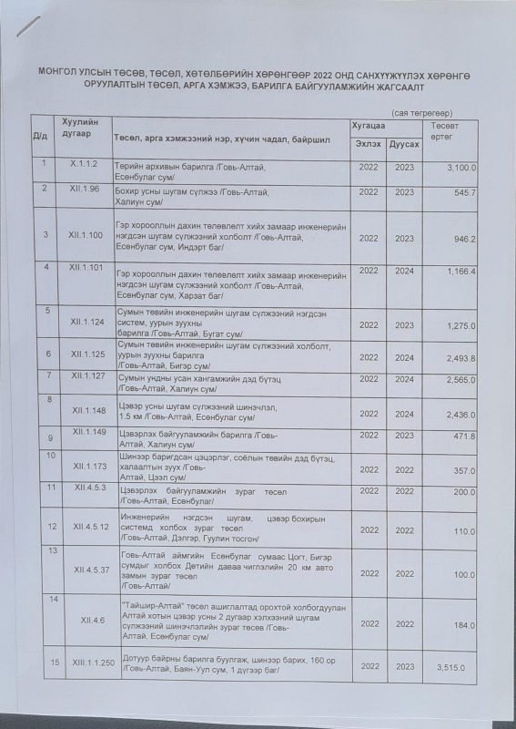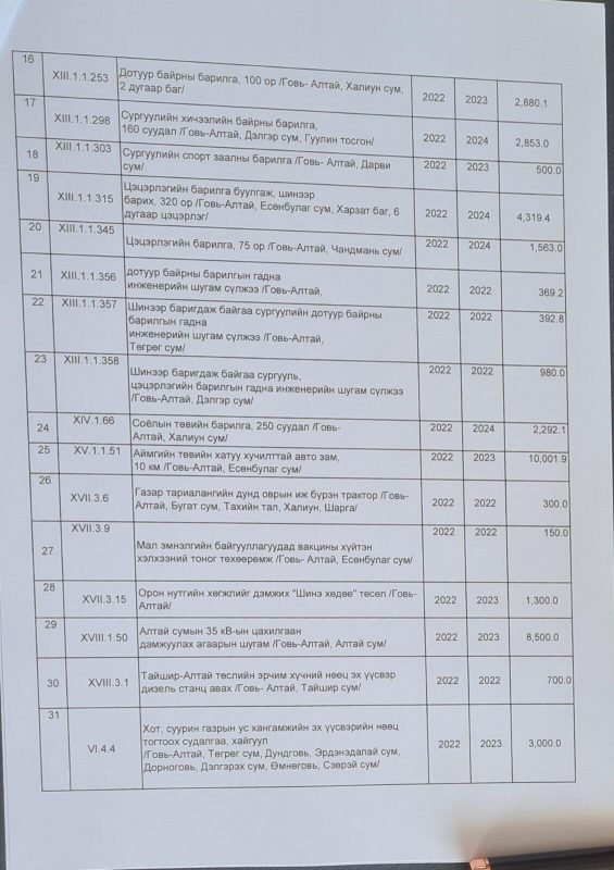 Түүнчлэн, Тайшир суманд Тайшир-Алтай төслийн эрчим хүчний нөөцийн эх үүсвэр дизель станц авах, Говь-Алтай аймгийн төв, Төгрөг, Дундговь аймгийн Эрдэнэдалай сум, Дорноговь аймгийн Дэлгэрэх сум, Өмнөговь аймгийн Сэврэй суманд хот суурин газрын ус хангамжийн нөөц тогтоох судалгаа хайгуул хийх, Зэрлэг амьтны хүрээлэн байгуулах ТЭЗҮ боловсруулах судалгааны ажил, Ээж хайрхан уулын байгалийн нөөц газрын аялал, жуулчлалын нөөц, даацын судалгааны ажил болон Цогт сум, Баянтоорой тосгонд Эрүүл мэндийн төвийн барилга, Бугат, Тахийн тал, Халиун, Шарга суманд Газар тариалангийн дунд оврын иж бүрэн трактор худалдаж авах, Халиун суманд Соёлын төвийн барилга барих, Дэлгэр суманд шинээр баригдаж байгаа сургууль, цэцэрлэгийн барилгын гадна инженерийн шугам сүлжээ, Төгрөг суманд шинээр баригдаж байгаа сургуулийн дотуур байрны гадна барилгын гадна инженерийн шугам сүлжээ, Чандмань суманд 75 ортой цэцэрлэгийн барилга барих, Дарив суманд сургуулийн спорт заалны барилга барих, Халиун суманд 100 ортой сургуулийн дотуур байрны барилга барих, Баян-Уул сумын нэгдүгээр багт байгаа сургуулийн дотуур байрыг нурааж 160 ортой барилга шинээр барих.