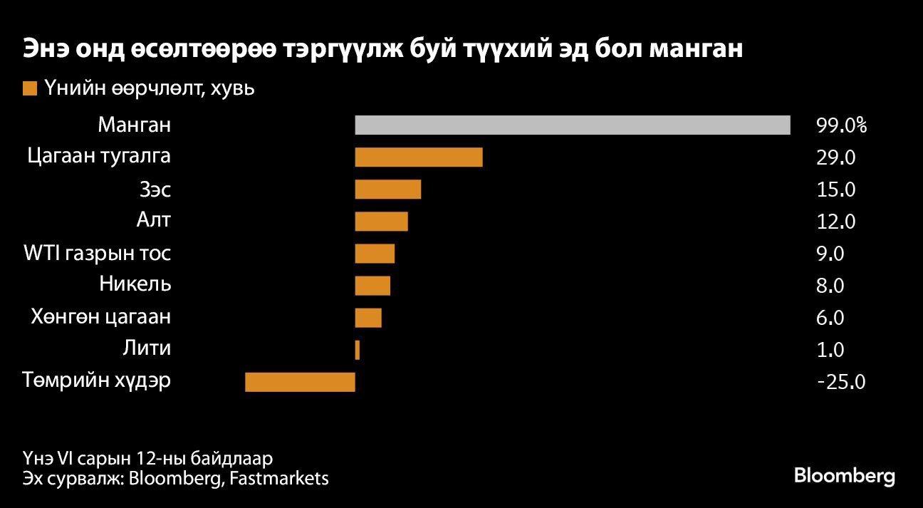 Энэ он гарсаар 44 хувийн агууламжтай манганы хүдрийн үнэ бараг хоёр дахин өссөн нь зэсийн 15 хувь, алтны 12 хувь, цагаан тугалганы 30 хувийн өсөлтөөс ч давах үзүүлэлт аж.