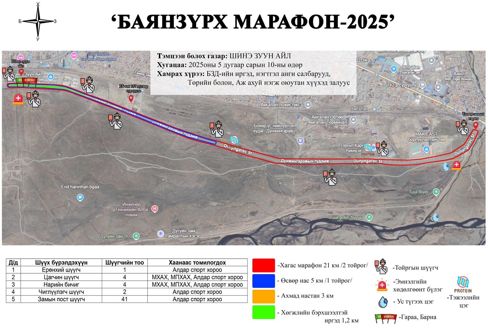 Харин “Баянзүрх марафон – 2025” гүйлт 07:00 – 14:00 цагийн хооронд болно. Тодруулбал, “Дүнжингарав” худалдааны төвийн урд авто зам дагуу “Шинэ зуун айл” худалдааны төвөөс зүүн тийш Төмөр замын гарам, Гачууртын зам хүртэл үргэлжлэх юм.