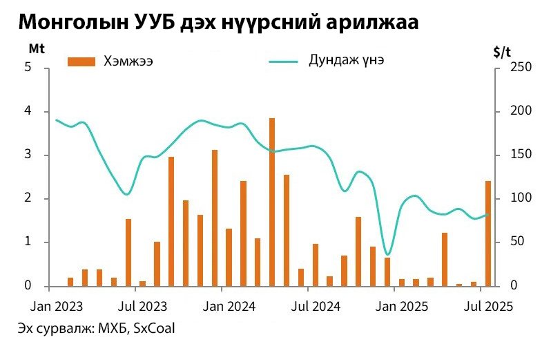 Үндэсний их баяр наадмын амралттай холбоотойгоор арилжааны өдрүүдийн тоо цөөрснийг үл харгалзан өнгөрсөн сард Монголын олборлогч компаниуд 447 удаагийн дуудлага худалдаагаар нийт 2.86 сая тонн нүүрс амжилттай арилжаалсан нь өмнөх сараасаа 940 хувиар өссөн дүн болсныг МХБ болон Sxcoal-ийн мэдээлэл харуулж байна. Энэ нь сарын дүнгээр 2025 оны хамгийн өндөр идэвхтэй сар болоод зогсохгүй эхний зургаан сарын арилжааны өсөн нэмэгдсэн дүнг 22 хувиар давжээ.