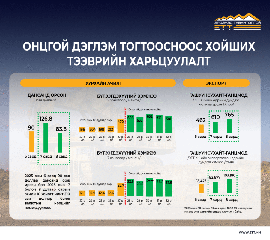 Монгол Улсын Засгийн газрын 2025 оны 07 дугаар сарын 09-ний өдрийн 26 дугаар тогтоолоор “Эрдэнэс Тавантолгой” ХК-д 3 сарын хугацаатай онцгой дэглэм тогтоож, тус компанид Засгийн газрын Онцгой бүрэн эрхт төлөөлөгчийн багийг томилон ажиллуулж байна.