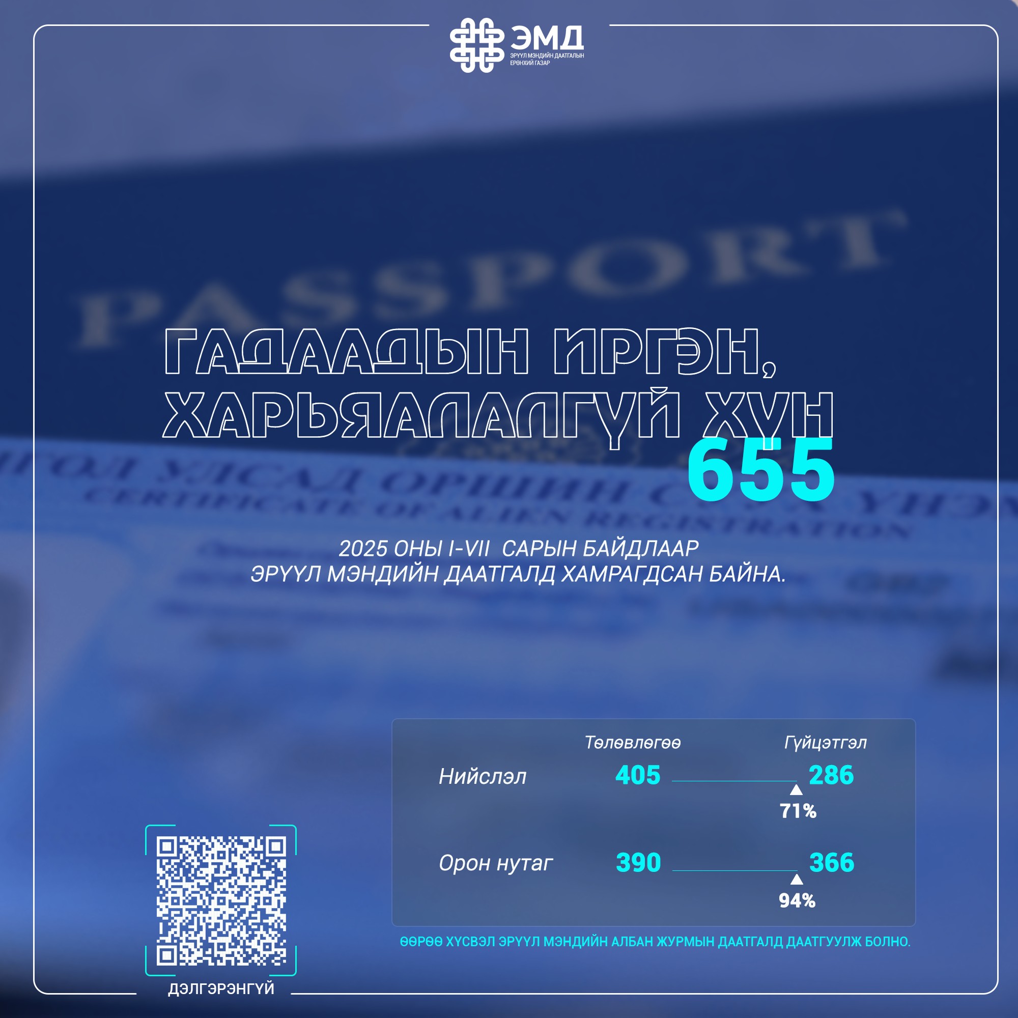1-7 сарын байдлаар 655 гадаадын иргэн, харьяалалгүй хүн ЭМД-д хамрагджээ.