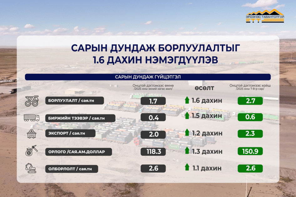 “Эрдэнэс Тавантолгой” ХК-иас долоо, наймдугаар сарын ажлын үзүүлэлт, үр дүнгийн мэдээллийг өнөөдрийн Засгийн газрын хуралдаанд танилцууллаа. Монгол Улсын Засгийн газрын 2025 оны 07 дугаар сарын 09-ний өдрийн 26 дугаар тогтоолоор томилогдсон онцгой бүрэн эрхт төлөөлөгчийн баг хоёр сарын хугацаанд борлуулалт, экспорт, тээврийг оновчтой зохион байгуулж ажилласны үр дүнд компанийн үндсэн үзүүлэлтүүд сайжирсан. Тухайлбал, компанийн сарын дундаж борлуулалтыг 1.6 дахин, биржийн тээвэрлэлтийг 1.5 дахин, экспортыг 1.2 дахин, орлогыг 1,3 дахин нэмэгдүүллээ.