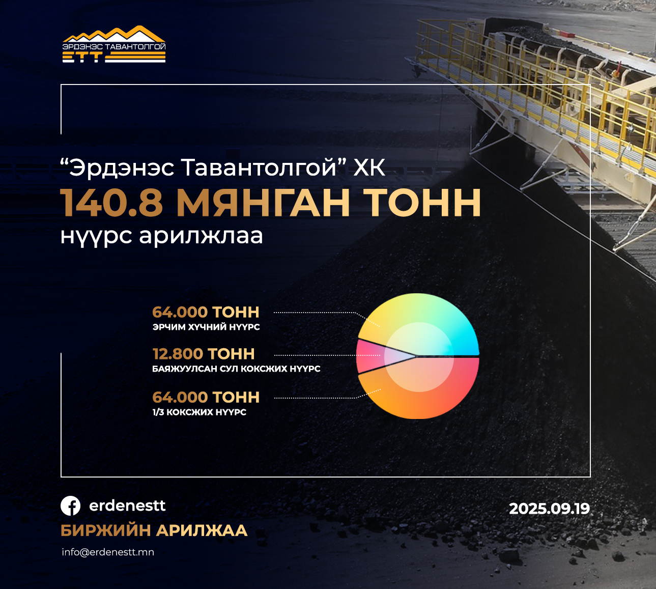 “Эрдэнэс Тавантолгой” ХК 2025 оны 9 дүгээр сарын 19-ний өдөр Монголын Хөрөнгийн Биржээр дамжуулан 3 удаагийн арилжааг амжилттай хийж 2.66 сая ам.долларын үнийн дүн бүхий 64,000 мянган тонн эрчим хүчний нүүрс, 1.16 сая ам.долларын үнэлгээ бүхий 12,800 мянган тонн Баяжуулсан сул коксжих нүүрс, 4.4 сая ам.долларын үнэлгээ бүхий 64,000 мянган тонн 1/3 коксжих нүүрс борлууллаа.