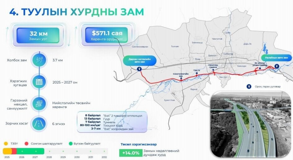 Тус төсөл нь Туул голын дагуу нийт 32 км урт, 6 эгнээ бүхий авто зам барихаар төлөвлөгдсөн бөгөөд Баянзүрх, Хан-Уул, Баянгол, Сонгинохайрхан зэрэг 4 дүүрэг, 15 хорооны нутаг дэвсгэр хамрагдаж байна.